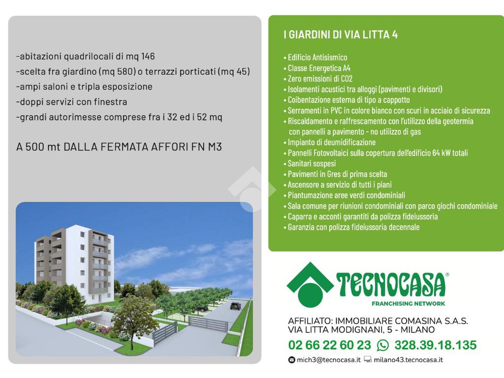 In contesto di nuova realizzazione denominato 'I GIARDINI DI VIA LITTA 4', proponiamo in esclusiva 12 unità abitative in edilizia libera residenziale con classe energetica A4.
